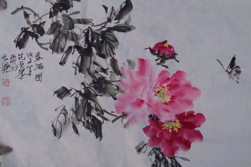 范云峰书画 作品:《春满园》 2008年6月,范云峰教授来到浙江长兴水口采风,入住紫笋庄园,感受乡野情趣。在这里完成多幅作品,《春满园》是其中之一。该幅作品中,牡丹花两朵怒放,一朵含苞,一只蝴蝶闻香而来。整个画面春意盎然,既有牡丹之富贵,又有春意之勃勃。 该幅作品被长兴友人收藏。 (本网评论员 陈廷玉)