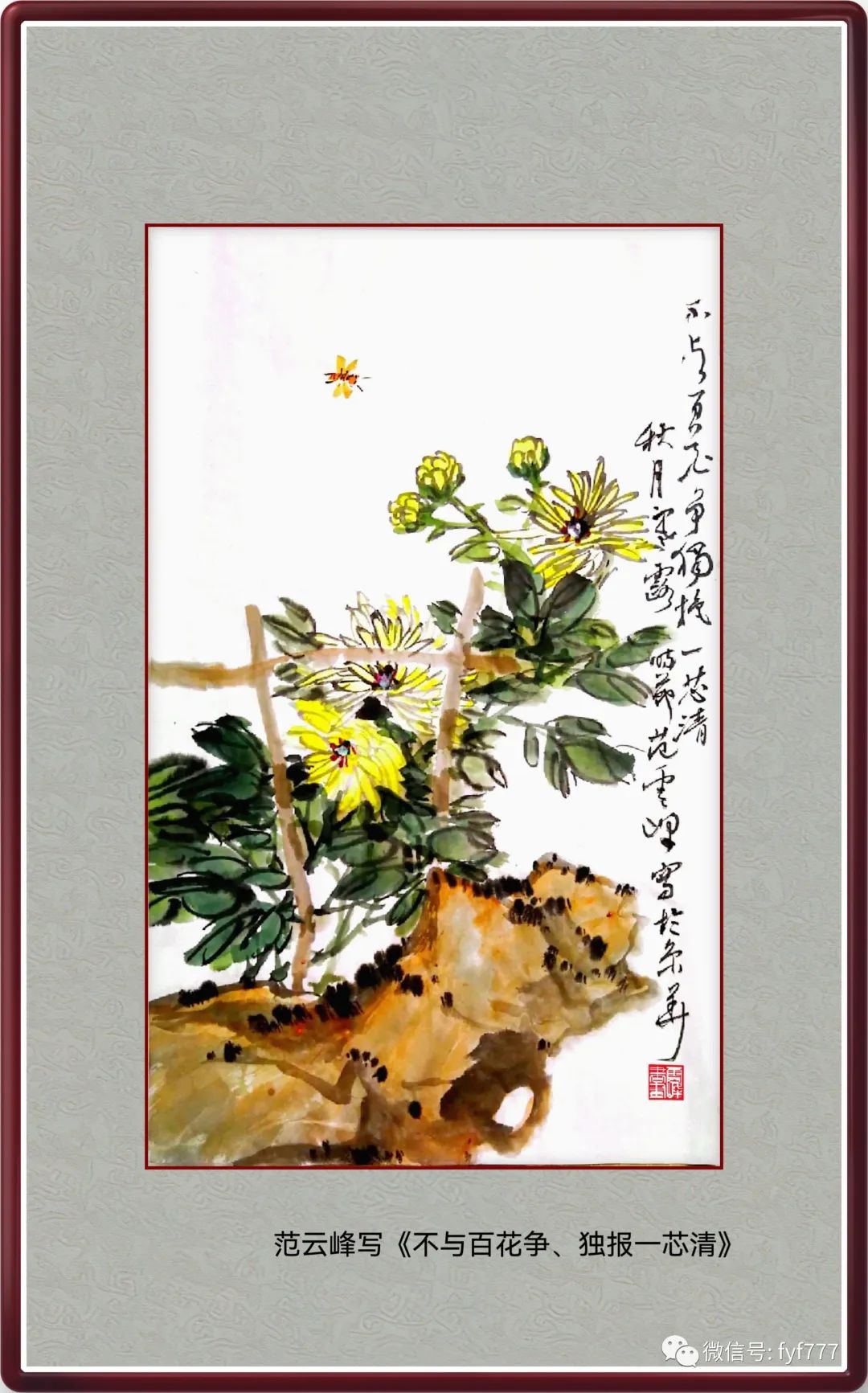 昨日我漫步在景山公园和中山公园,一股淡淡的菊花香扑鼻而来,满园的菊花竞相开放,它们不与百花争艳,独自在秋天里绽放。这让我深感菊花的傲霜之姿和高洁气质,让我回想起南宋诗人郑思肖的《寒菊》诗:“花开不并百花丛,独立疏篱趣未穷。宁可枝头抱香死,何曾吹落北风中。”于是,回到工作室,我提笔勾勒,写出一幅《不与百花争,独报一芯清》的菊花图。然,在这幅图中,菊花不与百花为丛,独自在在秋天开放;它稀疏地开着篱笆旁