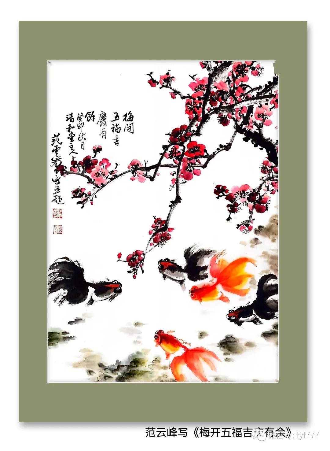 首先我先构思画面的元素和布局,故,在画面的主要元素是五条活泼可爱的金鱼和几株盛开的红梅。至此,两条红金鱼和三条黑金鱼在画中形成了一种颜色上的对比,给传统国画增添了些许现代感。而梅