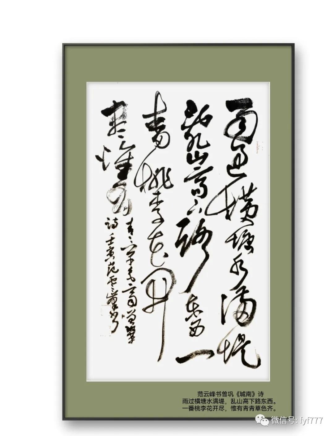前天在盛泽和同学朋友一起聚,一朋友要草书曾巩《城南》诗一幅,写后就和朋友聊起此诗此意以及草书的书写话题。就此诗来说:“雨过横塘水满堤,乱山高下路东西。一番桃李花开尽,惟有青青草色齐。”诗人却是通过对这些看似平凡事物的描绘,以暴雨过后与“桃李花开尽”与“青青草色齐”的对比,暗示了一个哲理:桃花、李花虽然美丽,生命力却弱小,小草虽然朴素无华,生命力却很强大,从而烘托出青草的难以摧毁的精神。从这幅草书来