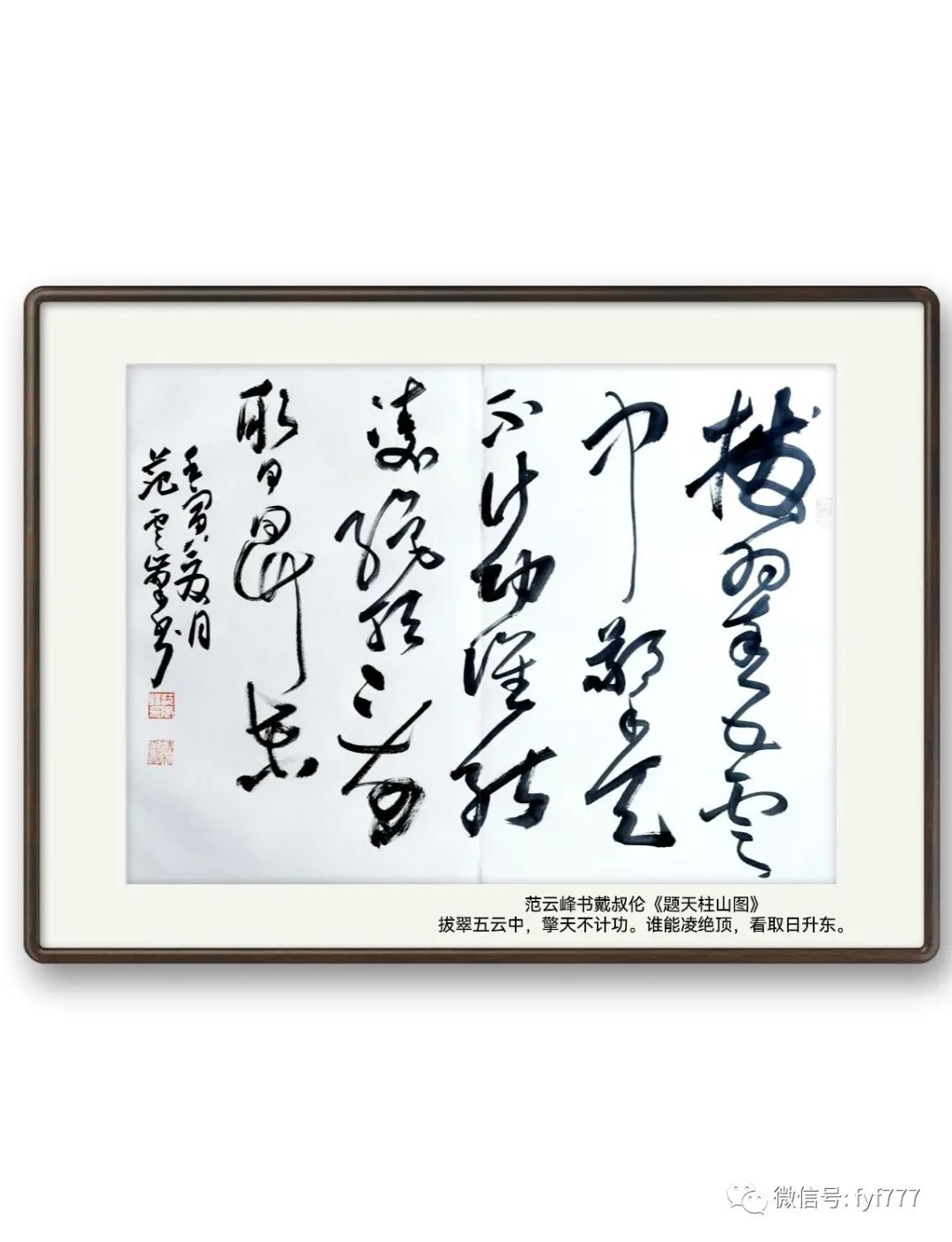 昨天在黄山永和居酒后朋友拿来一册页,让写一页,就随手用草书写了唐戴叔伦一首《题天柱山》诗,这首诗“拔翠五云中,擎天不计功,谁能凌绝顶,看取日升东”,是说天柱山超拔群山支撑着整个天空,天柱山却不因自己功大而自矜。暗示人们功而不计,对能建大功、立大业而又谦逊不骄矜之人,才能获得人们的称颂和敬仰。而书写此诗时脑子里瞬间觉得要和诗意融合,就用草书书写,力求书作中做到质朴无华,从笔法上体现书作的&#1211