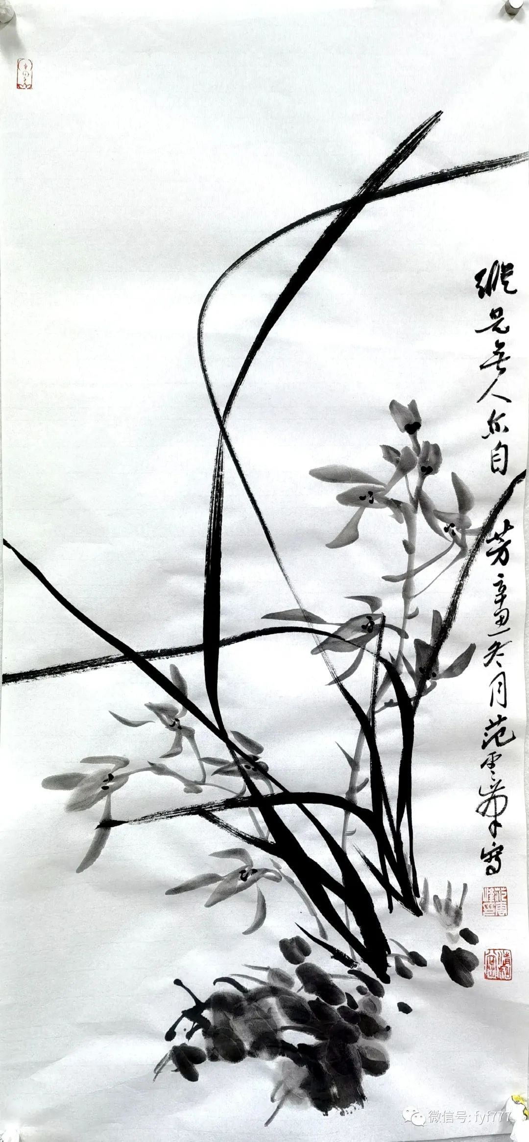 这两天三语聊到写兰花基本画法和笔法,朋友说很实际、按其画了几幅兰花,觉得比以前画的好的多了,但总有点说不出来的问题,拍照图片发给我看。看后,我觉得确实画的不错,不管是兰叶的笔法,还是长短穿插,都挺好的,然而仔细观察后发现缺乏远近、前后之别。这是一个重要的问题,那就是在用笔时缺少墨法。墨法有五色,即焦、浓、重、淡、清之别。焦墨是极浓而干的墨。如果是用书画墨汁,则倒出后的墨汁尚须放之沉淀有浓稠之态后使