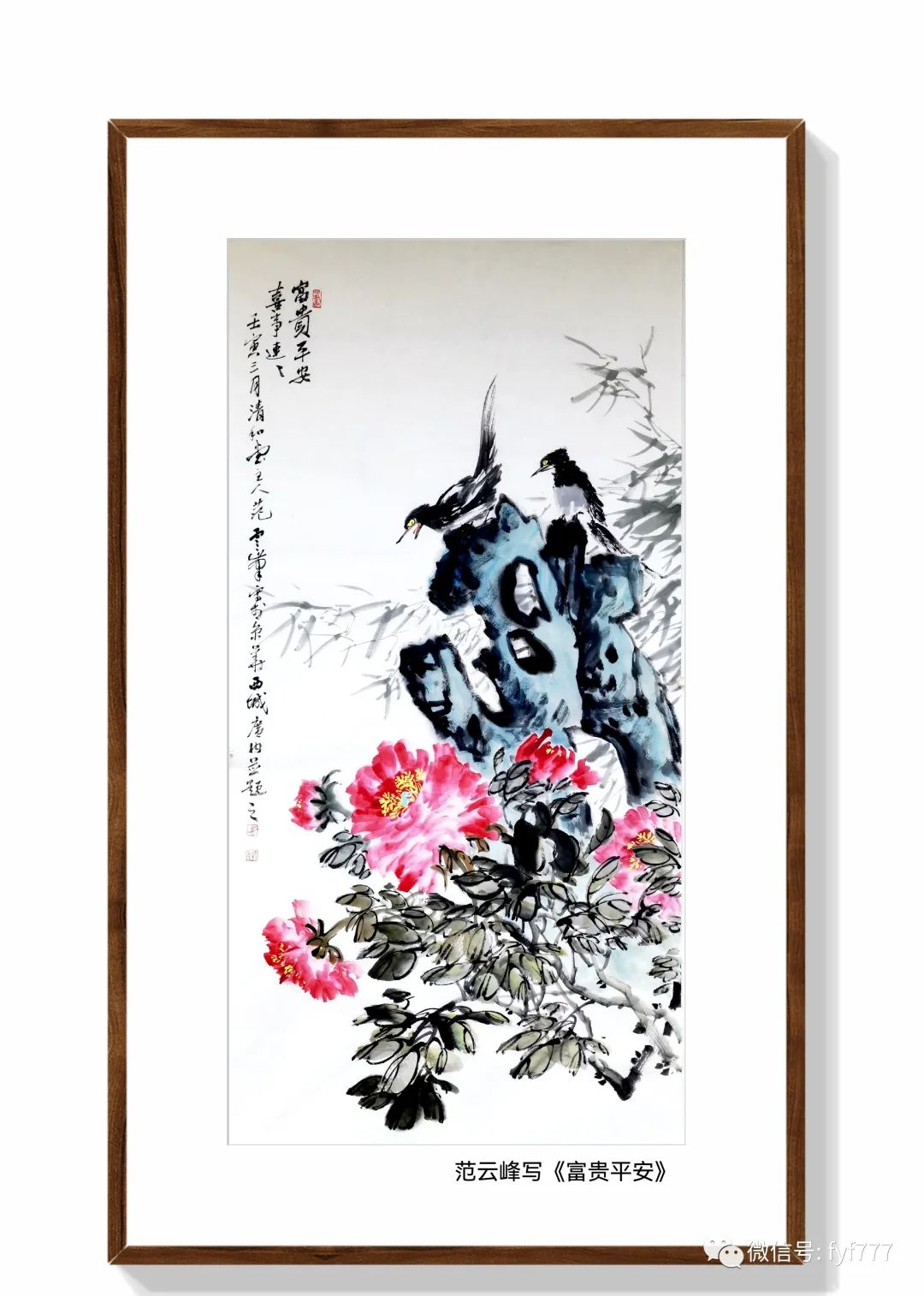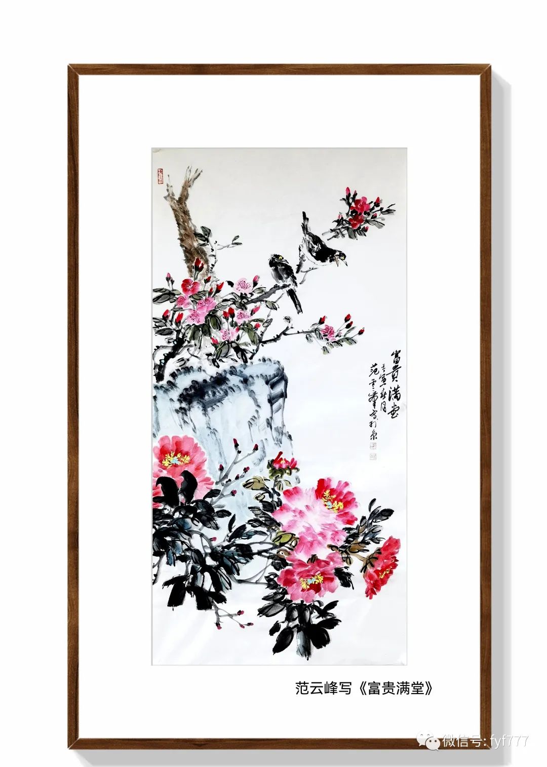 昨天五一节,应红军之邀和画家王建平老师,策划家李光斗老兄,及书法家赵伟松先生等朋友去海淀邓庄观赏牡丹。回之提笔涂之此幅《富贵满堂》图。意将看到的又大又美、重重叠叠的红花、及中央吐出了鹅黄色的花蕊,艳丽动人、一阵风拂过,散发出一阵阵迷人的清香,令人心旷神怡的牡丹花写出来。其构图采用牡丹花在前下方的位置,后中有奇石,后有海棠花和两只小鸟依偎在一枝长着花蕾的细枝上,做起飞前的蓄势动作,仿佛是准备飞向下边