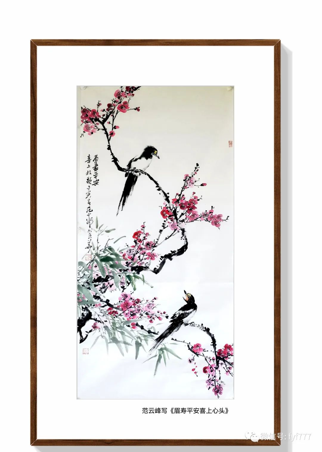昨天与朋友去了“京西第一村”鱼斗泉村,在书记领引下参观村容村貌,看到很多古树,特别是核桃树和在古梅树,并时而看到喜鹊飞来飞去,席间聆听了老书记讲这里的老人多的话,刹那间想到梅花是花中寿星寓意。回来后便提笔挥毫写了这幅《眉寿平安,喜上心头》图。梅花民间有“四德“、“五福”的说法,四德”就是:“初生蕊为元,开花为享,结子为利,成熟为贞”。梅花的五个花瓣代表着吉祥,为福、禄、寿、禧、财,五个吉祥神。梅还