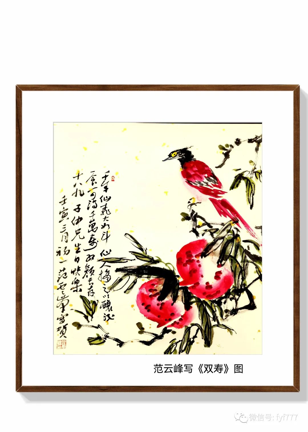 昨天晚上几位好友相约来工作室小聚,我为每人写上自己喜欢的词语、名句,正准备收笔开宴,一朋友带着蛋糕进来,我有点蒙了,问今天是谁的生日啊?一友说是吴哥的生日,我有点诧异,随口说让老婆拿纸挥毫写了一幅《双寿》图来祝贺!这幅图运用传统中国绘画常用的谐音手法,来表达祝福。画了绶带鸟和仙桃,借景抒情,托物抒怀,以此祝贺吴哥生日快乐,幸福安康!桃子,不仅是深受人们喜爱的水果,在民间神话中是来自天界的仙果,称为
