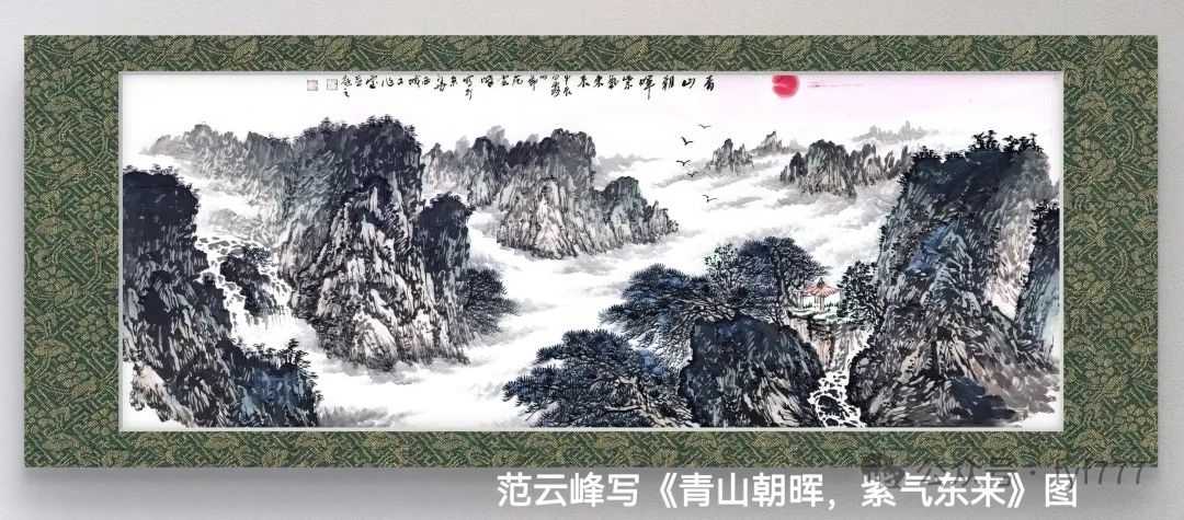我,清和堂主人范云峰,前些时日在黄山,受朋友之托创作一幅横式山水画。几日的深思熟虑,加上两天的精心绘制,这幅《青山朝晖,紫气东来》山水画今日终于完成。当最后一笔落下,一股难以言喻的满足感与成就感如潮水般涌上心头,仿佛这幅画凝聚了我对自然之美的全部感悟与深沉热爱。